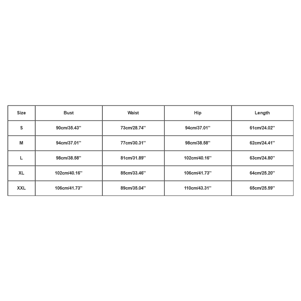 | Size:S | Bust:90cm/35.43'' | Waist:73cm/28.74'' | Hip:94cm/37.01'' | Length:61cm/24.02'' |