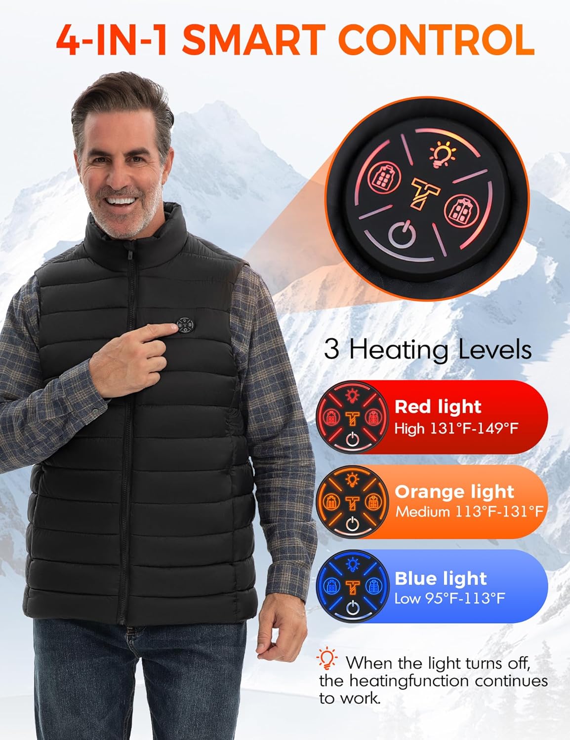 • 4-in-1 Smart Heating Control: The winter heated vest can be adjustable for the entire area or independently for front and rear sections, offering flexible heating as needed. Three precise temperature settings (95°F–149°F) of warming vest‌ allow customization for different needs, whether you prefer gentle warmth or intense heat.
